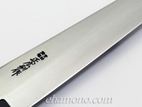 和包丁には刺身包丁や薄刃包丁などのマチ付と出刃や鰻裂などのマチ無しがありますが、 マチ付の包丁は先からマチまでの寸法を表示。 マチ無しの包丁は刃渡り(アゴから先まで)の寸法を表示してあります。 ★洋包丁は全て刃渡り寸法を表示しています。 ※使いやすいサイズは… 柳刃:本職用でしたら240mm〜330mm、家庭用や趣味の方でしたら180mm〜240mm。 出刃:家庭用でしたら135mm〜165mm、プロの方は用途によりますね。 (刃物は、大は小を兼ねません、特に慣れない方は小さめの物の方が使いやすいです。)
