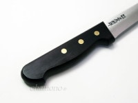 和包丁には刺身包丁や薄刃包丁などのマチ付と出刃や鰻裂などのマチ無しがありますが、 マチ付の包丁は先からマチまでの寸法を表示。 マチ無しの包丁は刃渡り(アゴから先まで)の寸法を表示してあります。 ★洋包丁は全て刃渡り寸法を表示しています。 ※使いやすいサイズは… 柳刃:本職用でしたら240mm〜330mm、家庭用や趣味の方でしたら180mm〜240mm。 出刃:家庭用でしたら135mm〜165mm、プロの方は用途によりますね。 (刃物は、大は小を兼ねません、特に慣れない方は小さめの物の方が使いやすいです。)
