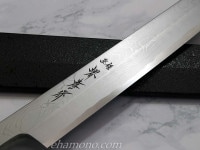ダマスカス多層鋼の母材に、安来青紙二号鋼を鍛接、丹念に鍛え上げた美しい刺身包丁です。