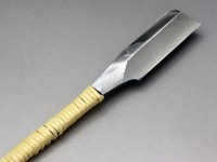顔面のへこんだ所は先を使うことが多いので、切先は刃付砥石に軽く押し付けて丸みを少しだけつけます。