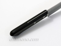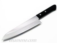 三徳より少し細身で刃渡りの長い青鋼本割込牛刀型、 お手頃なツバなし黒合板柄です。