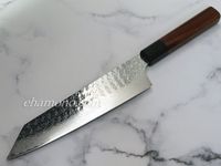 その粉末ハイス鋼Super Gold 2を芯材に使用し、美しいダマスカスの刃紋と独特の鎚目が魅力的な和式剣型牛刀です。