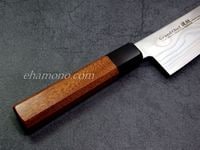ハンドルは、ローズウッドと黒檀を合わせた八角柄で、落ち着いた色合いもあいまって、ダマスカスの刀身によくマッチしています。